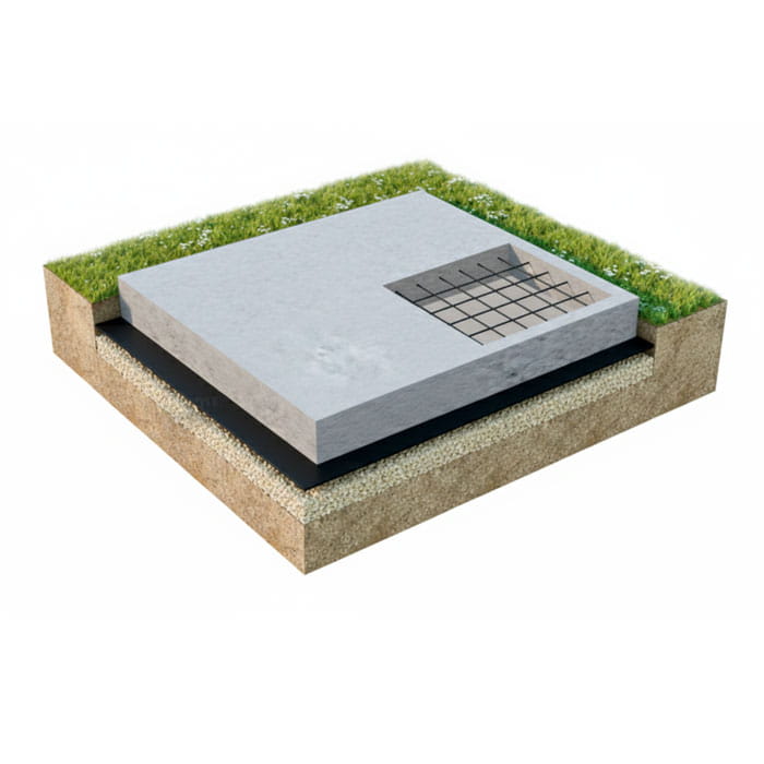 Мы выполняем подготовку основания, устройство песчано-щебёночной подушки, гидроизоляцию и двойное армирование. При необходимости делаем утеплённую шведскую плиту с интегрированными коммуникациями и тёплым полом.